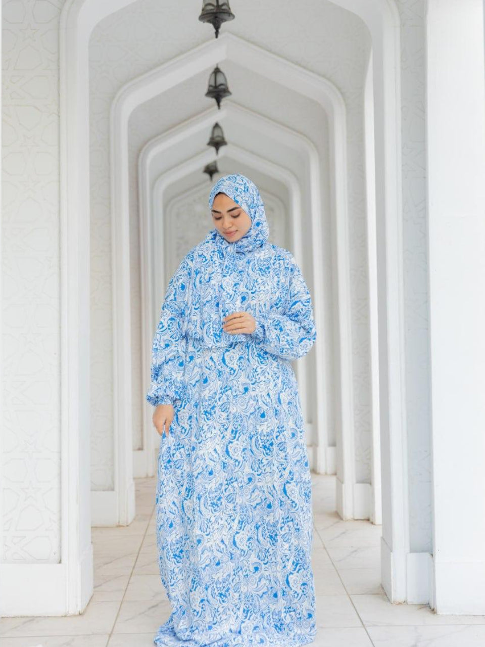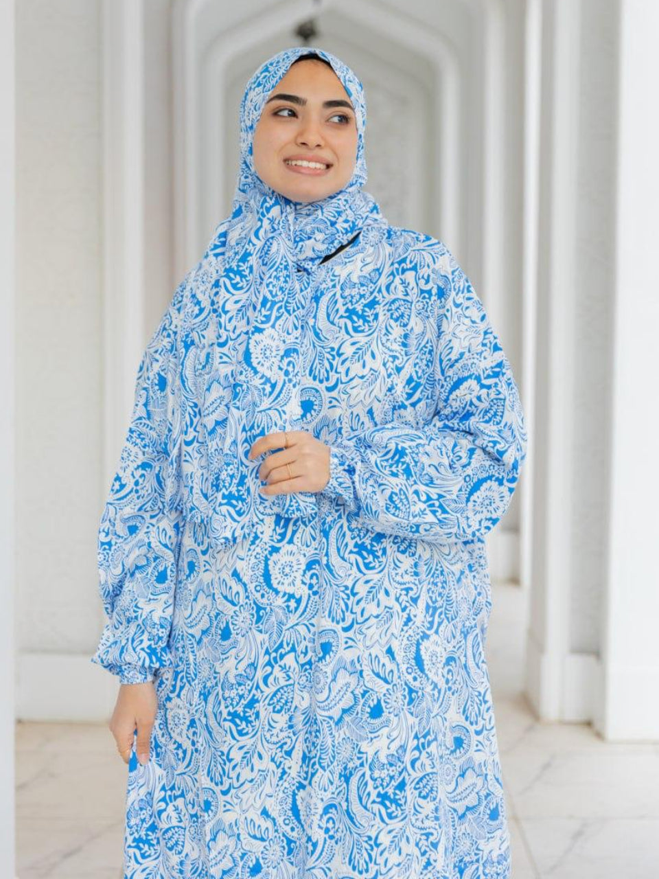 Experience ultimate comfort and style with the Blue Paisley One-Piece Cotton Viscose Pray-set with attached head cover. Made with luxurious cotton viscose material .The one-piece design eliminates the hassle of styling making it a convenient and perfect for prayer choice.