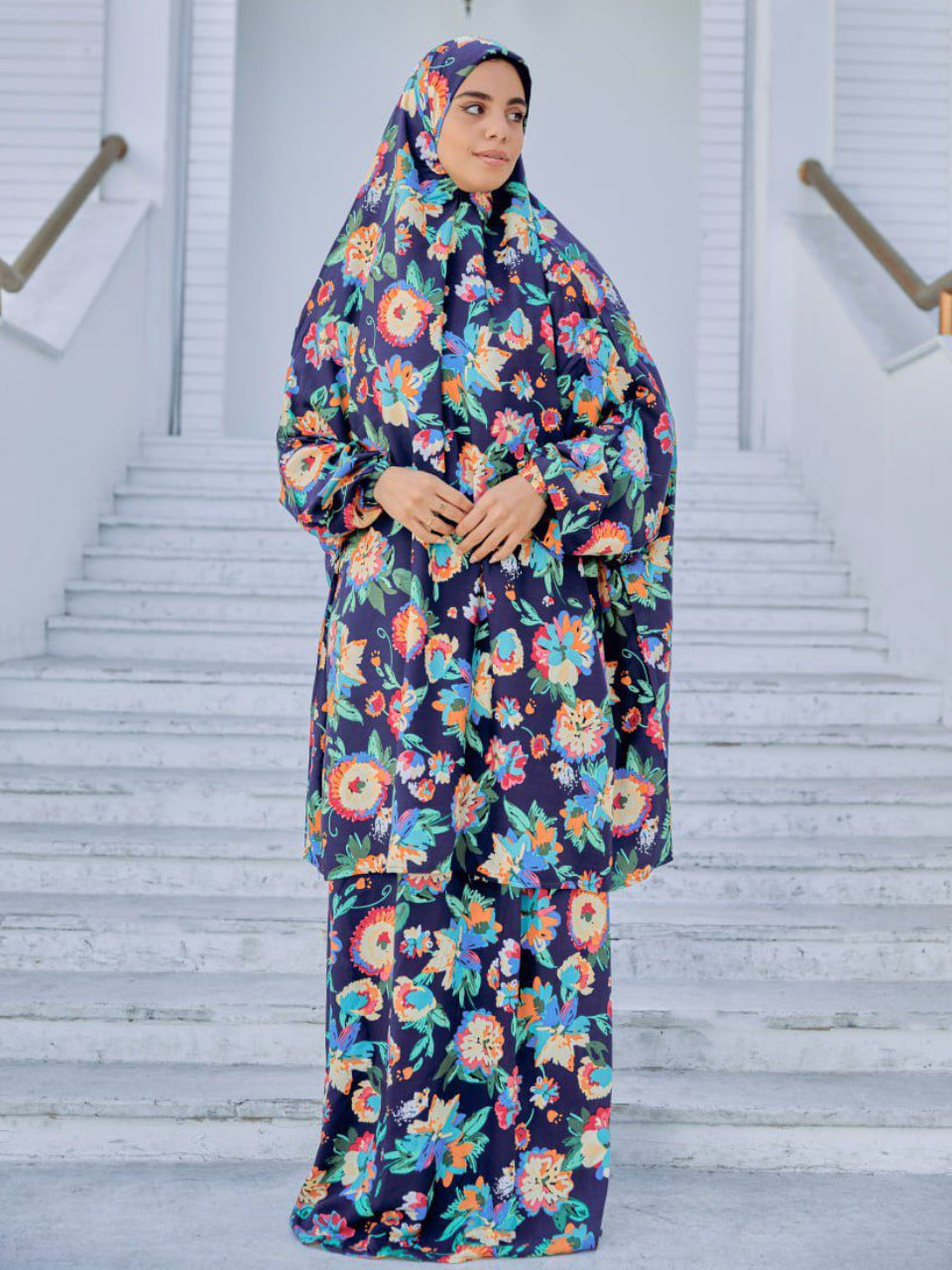The Flora Two-Piece Cotton Viscose Prayest offers a stylish and comfortable solution for modest attire. Made with a soft and breathable cotton viscose blend, this set includes a skirt, top and head cover for a complete look. Perfect for those seeking elegant and practical options for prayer.