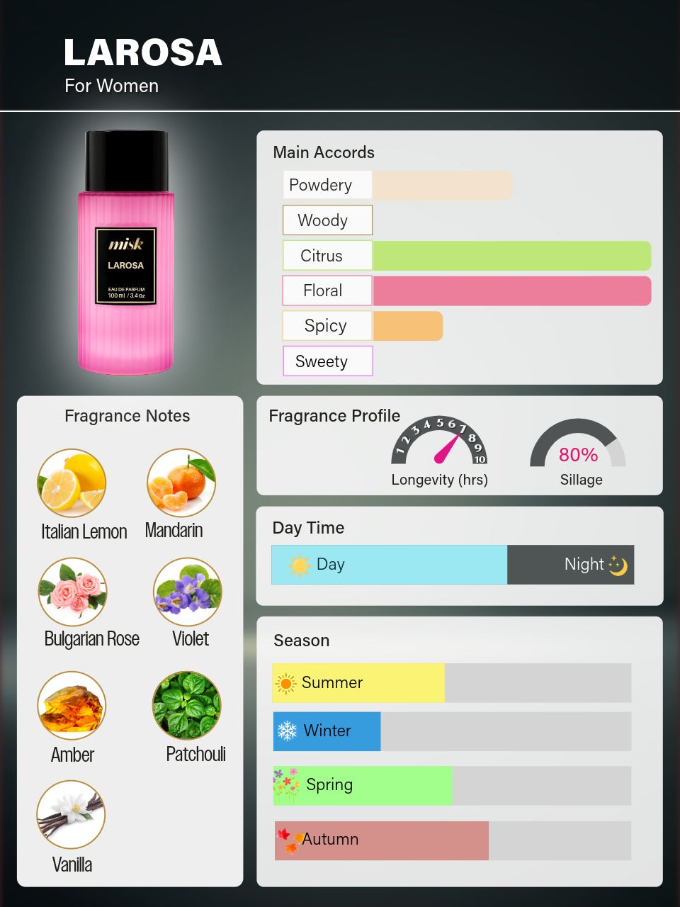 This long-lasting oriental perfume opens with the sparkling freshness of Italian lemon and mandarin, before unfolding into a bouquet of Bulgarian rose touched with delicate violet leaf. As the fragrance settles, warm amber, smooth vanilla, and earthy patchouli create a sensual, lingering trail that feels both elegant and unforgettable.