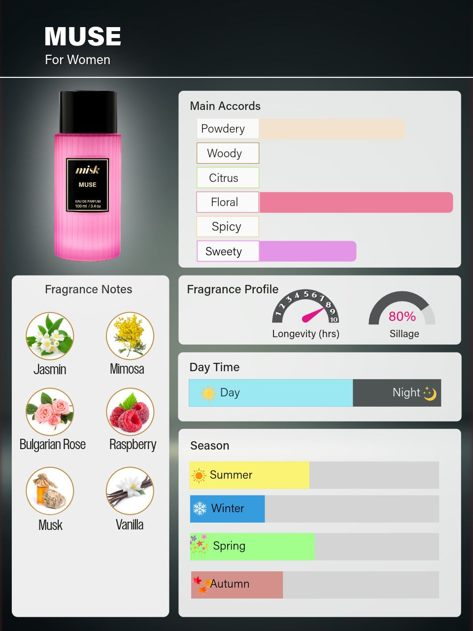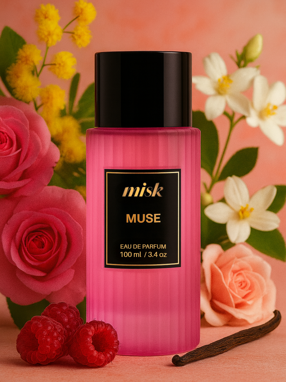 This long-lasting oriental perfume opens with luminous jasmine and wild rose, unfolding into soft mimosa and a touch of sweet raspberry. The base of musk and vanilla creates a sensual warmth, leaving a feminine trail that inspires and captivates.