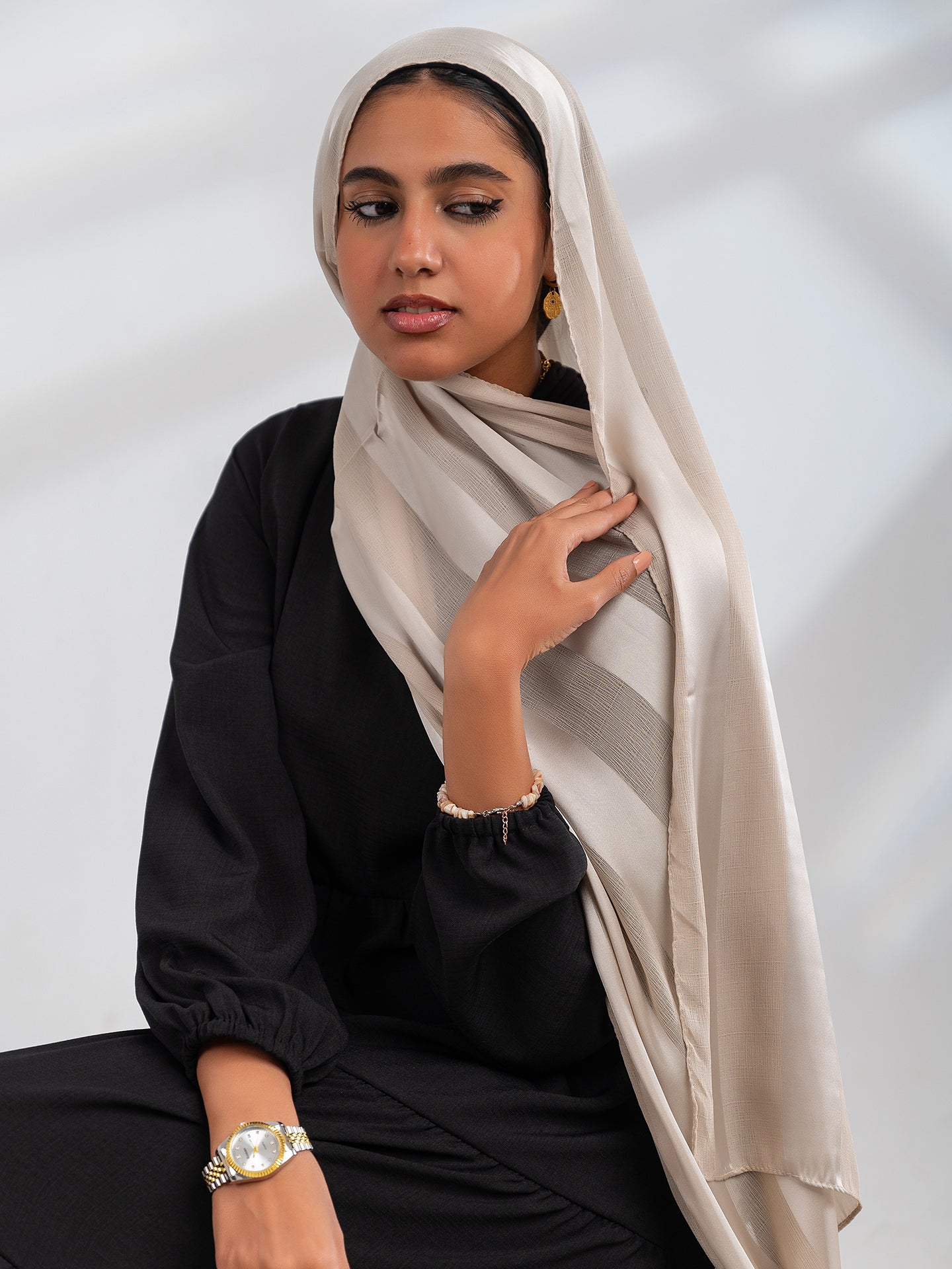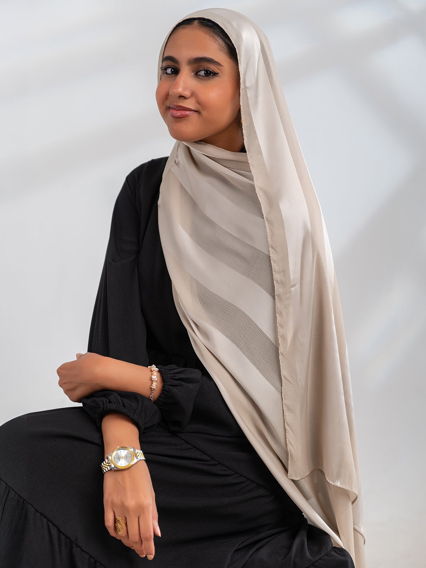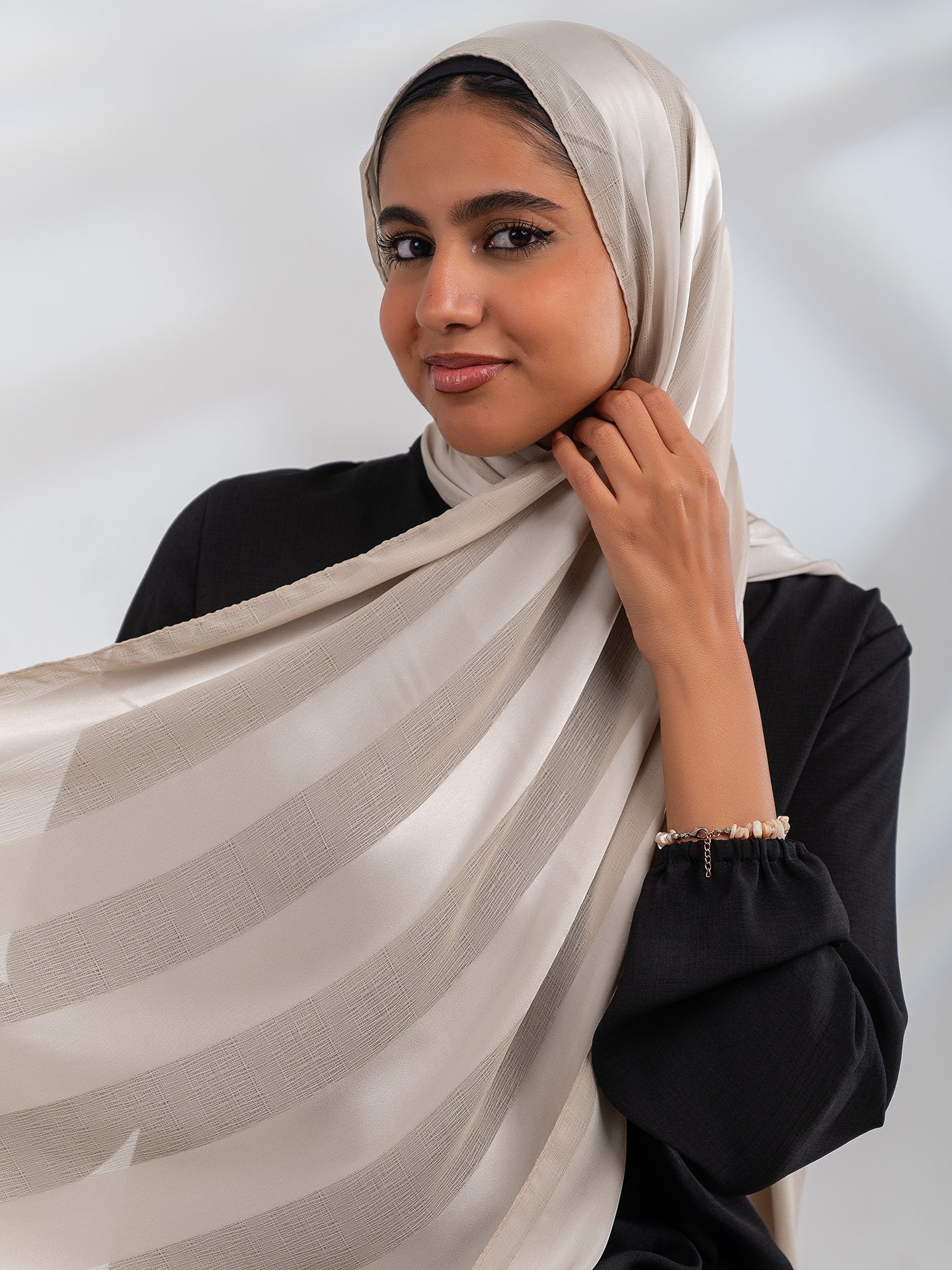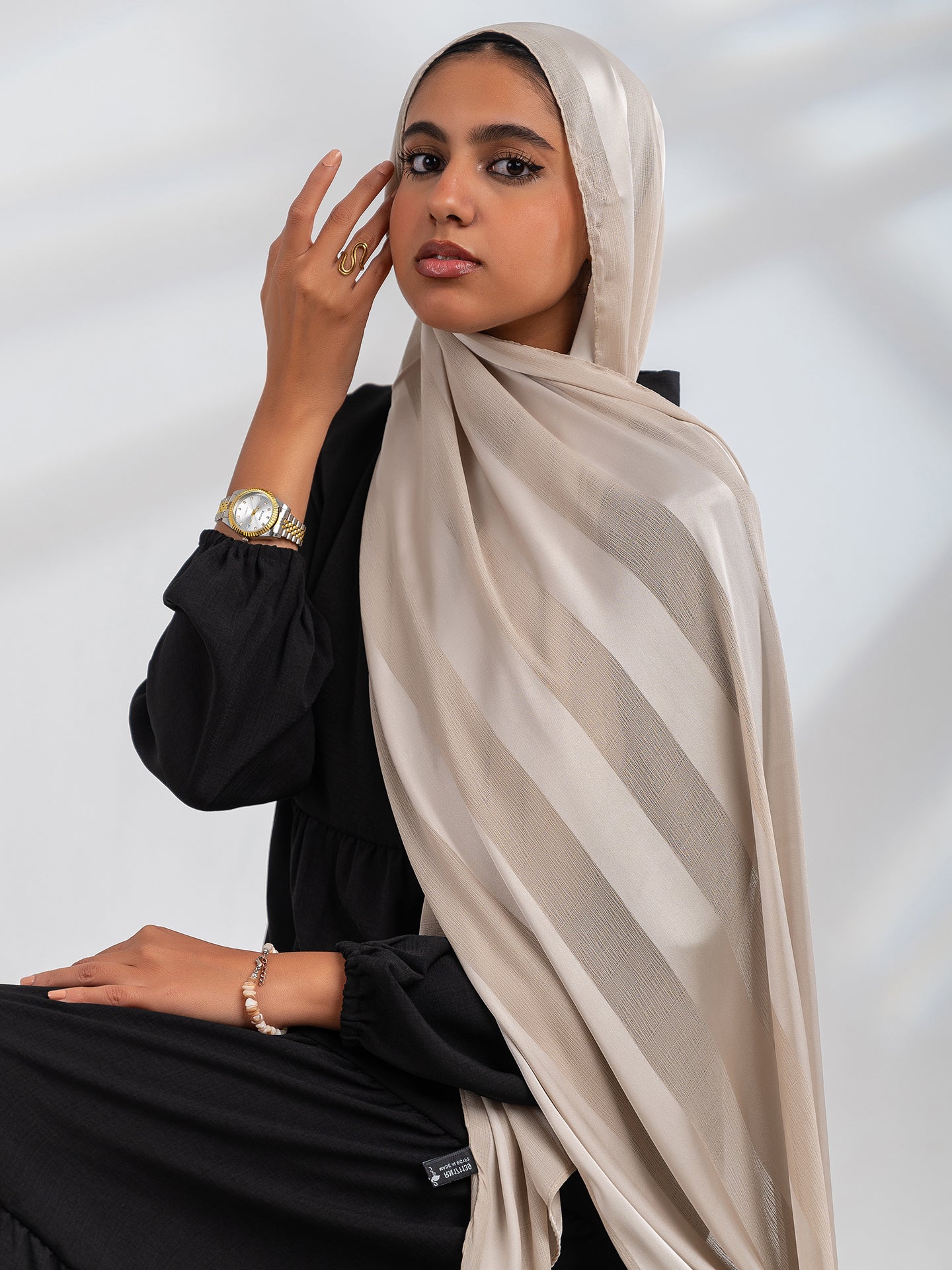 Satin chiffon blend scarf adds a touch of elegance to any outfit with its subtle striped design. Made from high quality materials, it offers a soft and lightweight feel, perfect for all-day wear. Elevate your style effortlessly with this luxurious accessory.