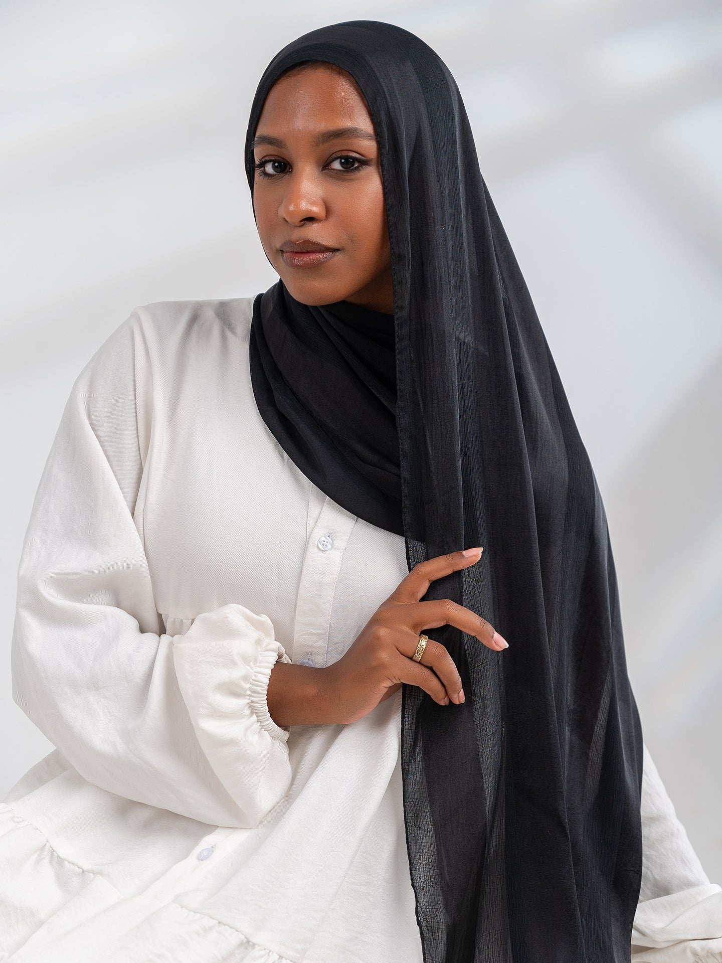 Satin blend scarf adds a touch of elegance to any outfit with its subtle striped design. Made from high quality materials, it offers a soft and lightweight feel, perfect for all-day wear. Elevate your style effortlessly with this luxurious accessory.