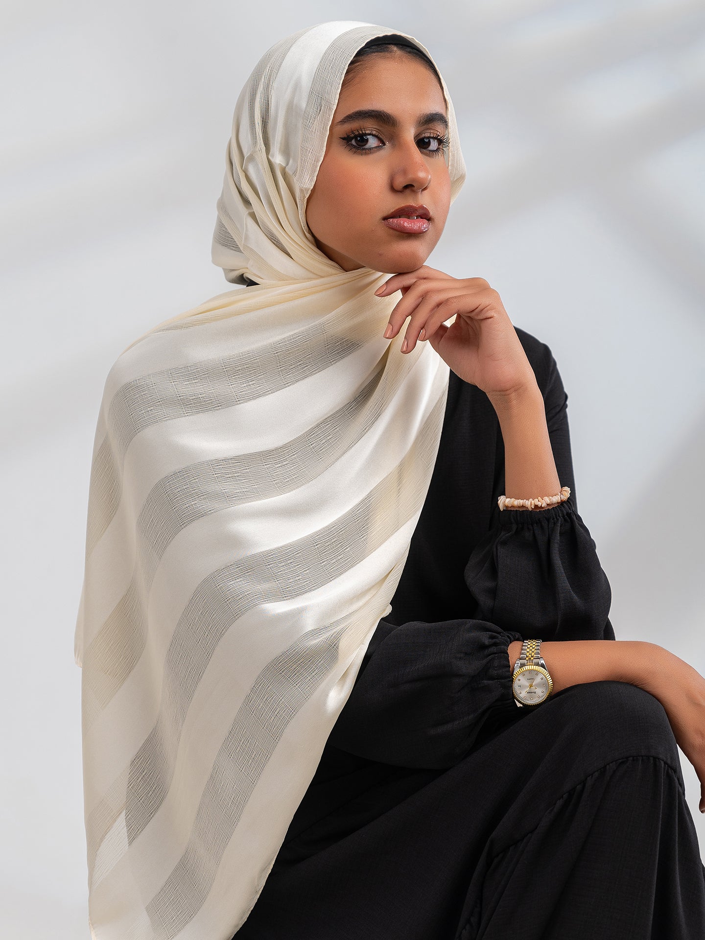 Satin blend scarf adds a touch of elegance to any outfit with its subtle striped design. Made from high quality materials, it offers a soft and lightweight feel, perfect for all-day wear. Elevate your style effortlessly with this luxurious accessory.
